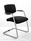 Посетительское кресло на хромированных полозьях с высокой спинкой. Задняя часть спинки - клееная фанера. Накладки на подлокотники из полипропилена.